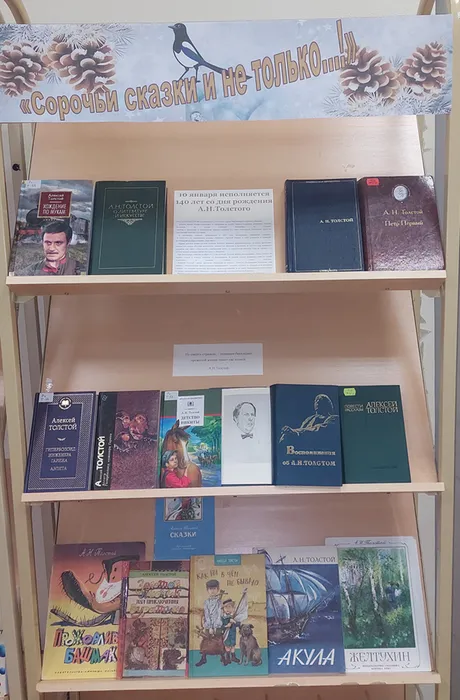 В честь 140-летия со дня рождения Алексея Толстого Центральная библиотека предлагает своим читателям книжную выставку «Сорочьи сказки и не только…!». На ней представлены книги о жизни и творчестве писателя (Виктор Петелин «Судьба художника», сборник «Воспоминания о А.Н. Толстом»), а также его самые известные произведения: «Петр I», «Хождение по мукам», «Гиперболоид инженера Гарина», «Аэлита» и другие. Для юных читателей – большой выбор детских книг Алексея Толстого: «Золотой ключик или Приключения Буратино», «Сказки», «Желтухин», «Акула», «Как ни в чём не бывало», «Прожорливый башмак».