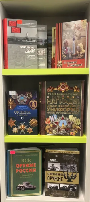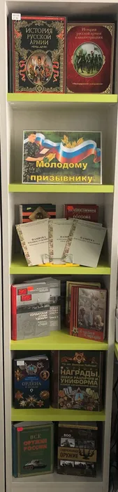 В библиотеке для молодых призывников оформлена выставка, на которой представлены книги о Российской армии, энциклопедии на военную тематику (оружие, экипировка, звания, медали). Также на выставке можно познакомится с краеведческими изданиями: «Солдатская слава Удомли», «Я помню! Я горжусь!», «Остались верными присяги».