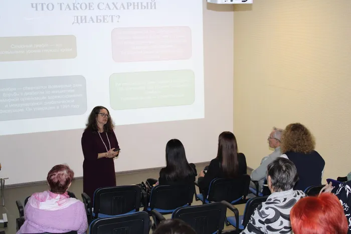 Нина Васильевна Грачева рассказывала присутствующим об одном из опаснейших заболеваний, которое приводит не только к инвалидизации человека, но и смерти. Диабет находится в тройке лидеров болезней, уносящих жизни людей. Эндокринолог рассказала о факторах возникновения диабета, о том, как распознать по появившимся симптомам начало заболевания, о рисках и тяжелых осложнениях болезни. Отвечая на возникающие вопросы присутствующих, Нина Васильевна делилась рекомендациями по профилактике заболевания: о ведении здорового и активного образа жизни, диетическом питании, о профилактическом осмотре ног и оздоровительной гимнастике. Вопросов врачу было много и на каждый вопрос был дан исчерпывающий ответ. Не смотря на серьезность темы, встреча с эндокринологом прошла позитивно и очень познавательно.