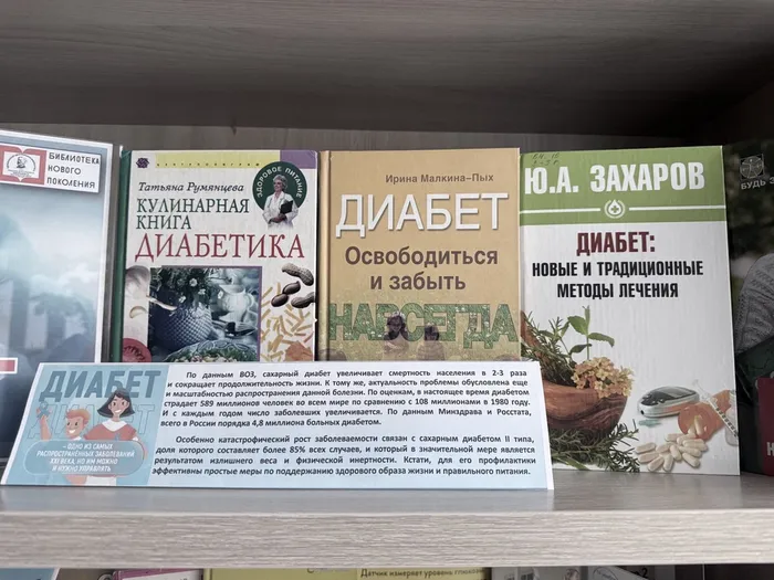 В библиотеке на взрослом абонементе работает информационная выставка «ДИАБЕТ – убийца века», которая рассказывает не только о страшных последствиях коварного заболевания, но и дает простые профилактические рекомендации о том, как противостоять страшному убийственному заболеванию «Сахарный диабет».