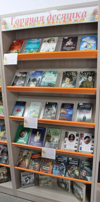 На взрослом абонементе библиотеки открылась книжная выставка-просмотр «Горячая десятка». Здесь собрались книги, которые читатели буквально «выхватывают с полок». Это отражение вкусов, настроений и даже моды – что сейчас в тренде, что заставляет сердце биться чаще и не откладывать книгу до утра.