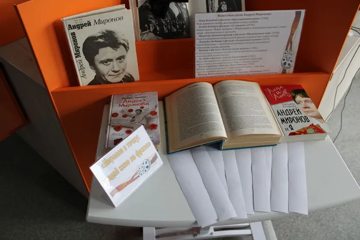 Знакомьтесь с книгами о творческом пути легенды советского кино и театра. Главная книга выставки – сборник «Андрей Миронов»: воспоминания тех, кто знал его близко, - педагогов, друзей, родных. А ещё – хроника жизни, где каждый год – новая глава большой истории.