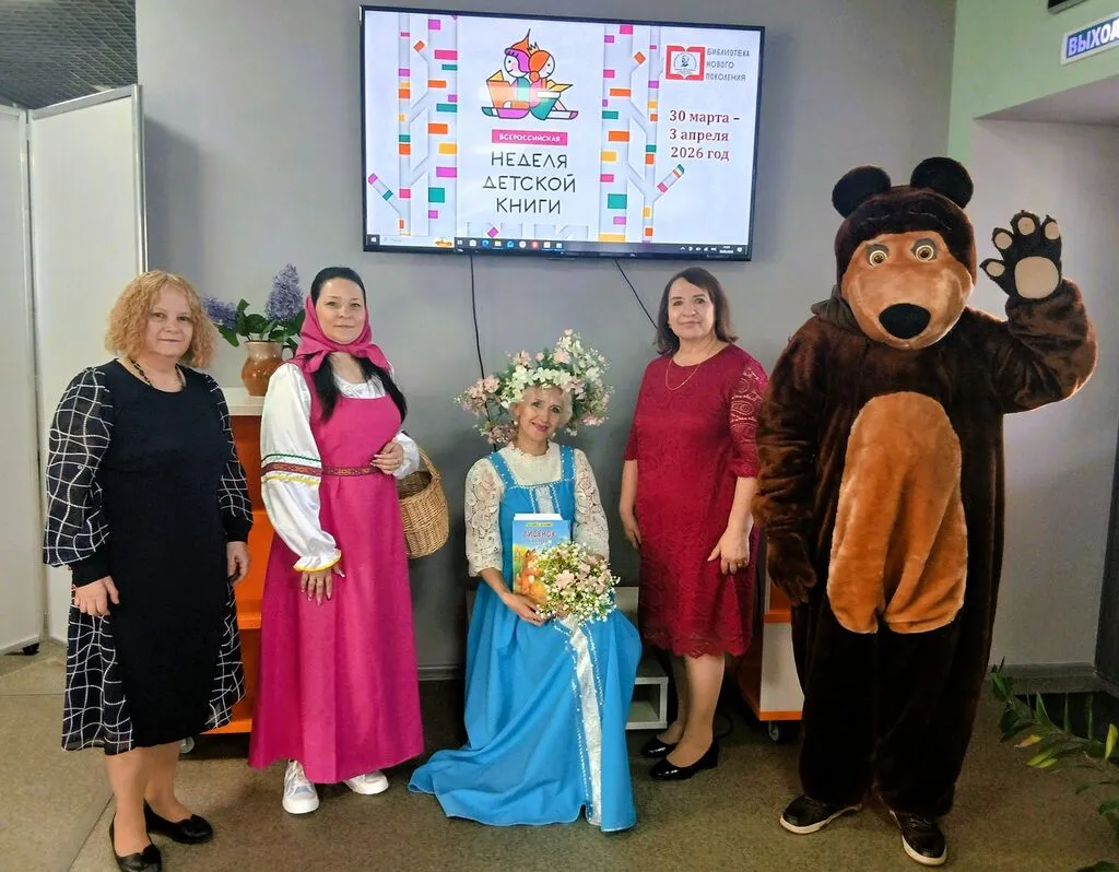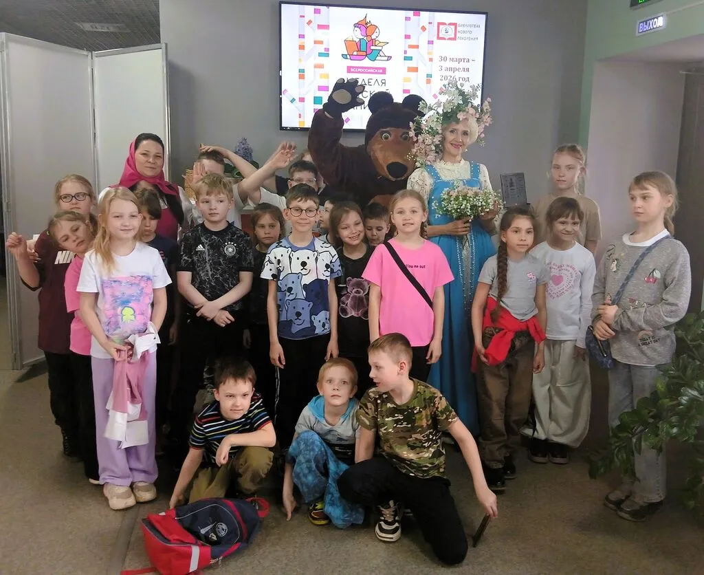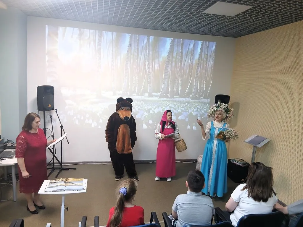 А затем в библиотеке появились сказочные гости – Весна, Маша и Медведь! Программа праздника была насыщенной: юный читатель Дима Сливка трогательно прочитал стихотворение о «Книжкиных именинах». Библиотекарь рассказала о том, как отмечали Неделю детской книги в годы войны, поведала историю, которая учит ценить слово даже в самые непростые времена. Сказочные герои загадывали весёлые загадки, а дети с удовольствием отгадывали сюжеты и персонажей любимых книг. Обзор книжных новинок от библиографа В.Г. Бурдовой стал настоящим праздником общения, ребята делились впечатлениями о прочитанных книгах и мечтали о новых литературных открытиях. В арт-холле звучали детские песни, а ребята с восторгом фотографировались со сказочными героями.