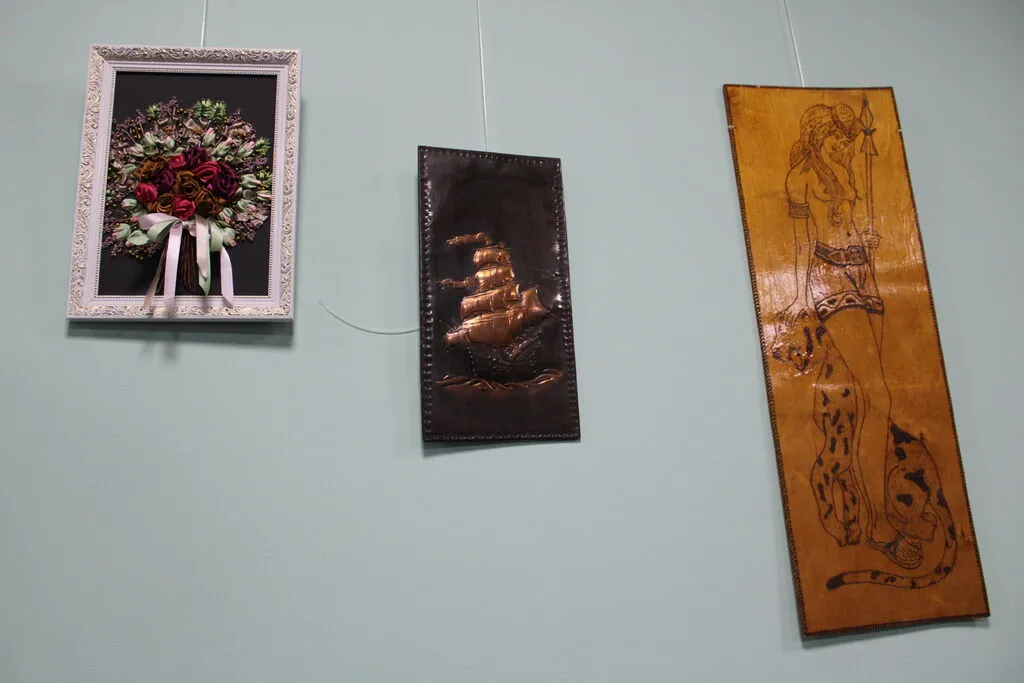 На выставке вниманию зрителей представлены шикарные женские броши, изящные украшения на голову, картины, цветочные композиции из фоамирана, чеканка и вышивка. Всего более тридцати творческих работ, которые очаровывают с первых мгновений.