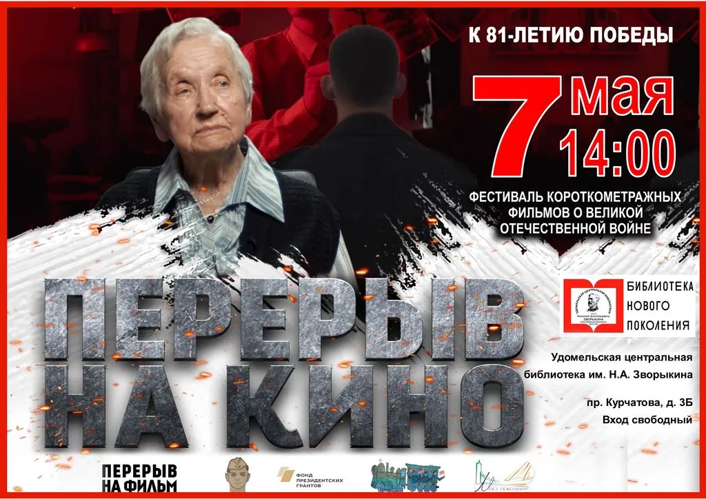 К 81-й Годовщине со Дня Великой Победы Фонд «Мост поколений» проводит Всероссийский показ фильмов военно-исторического кинофестиваля «Перерыв на кино». Зрителям будет представлена 45-минутная программа из пяти кинокартин, среди которых два мультфильма (6+) - «Баллада об угольке» и «Паровозик Победы», две художественные ленты (6+) «Фотограф» и «Реквием», а также документальный фильм «Главное в мире - добро» (6+) о жительнице блокадного Ленинграда Евгении Фёдоровне Зубаревой кинопроизводства «Перерыв на фильм».